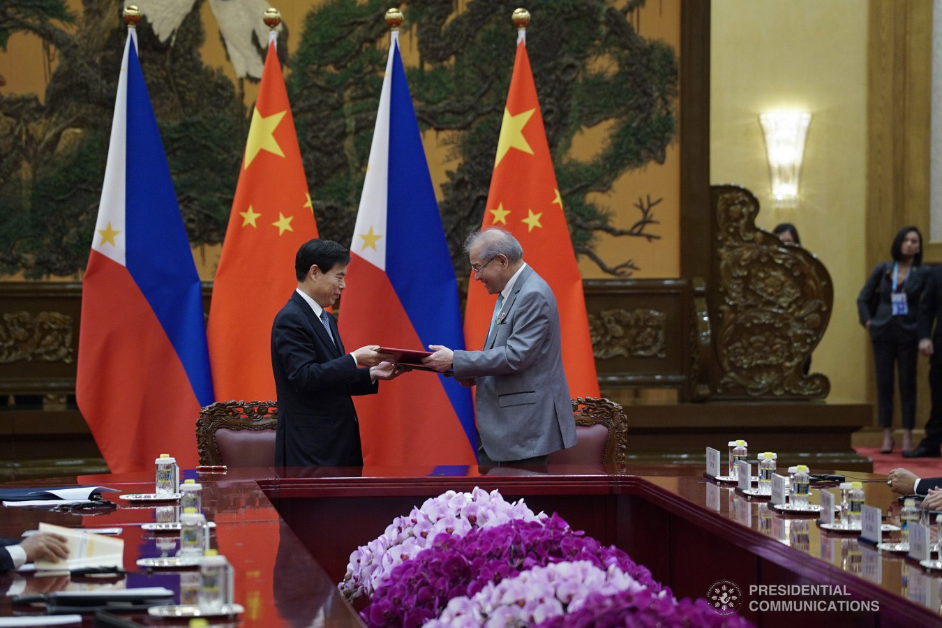PH-CHINA INK COOPERATION AGREEMENTS. Philippine Ambassador to the People’s Republic of China Jose Sta. Romana and Minister of Commerce Zhong Shan exchange signed agreements following the successful bilateral meeting at the Great Hall of the People in Beijing on April 25, 2019 ahead of the 2nd Belt and Road Forum for International Cooperation. The agreement is on hand-over certificate of grant-aid for the dangerous drugs abuse treatment and rehabilition centers project between the Government of the Republic of the Philippines and the Government of the People’s Republic of China.