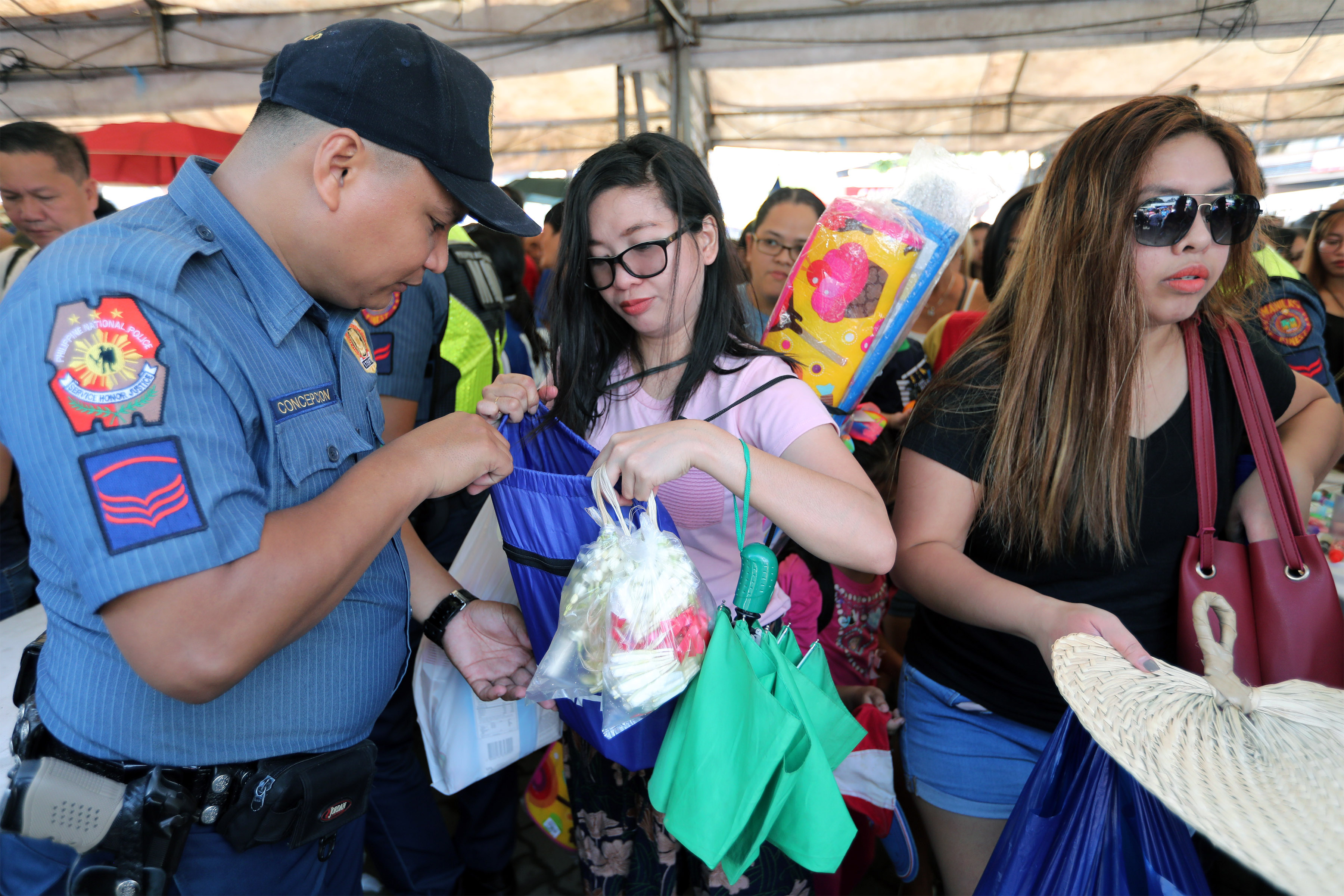 FILE: INSPECTION. A police officer of the Manila Police District (MPD) inspects personal belongings of visitors entering the Manila North Cemetery on Friday (Nov.