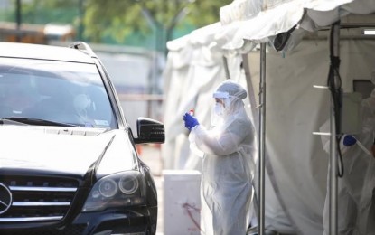 MORE TESTING OPTIONS. A health worker from the Taguig city government gets a swab sample from a motorist at a drive-thru testing center in Bonifacio Global City on Wednesday (April 29, 2020). Aside from drive-thru testing centers, those who do not have personal vehicles can avail of ‘hatid sundo’ service where they will be brought to a health center by an ambulance for testing.