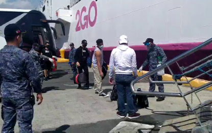 FILE: Overseas Filipino workers board a quarantine ship facility in April. (PNA photo)