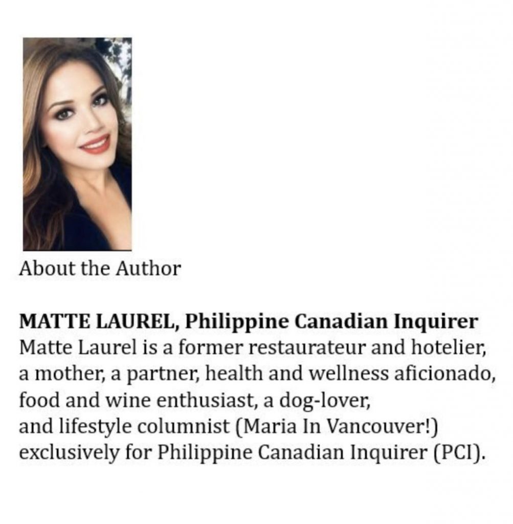 9:30pm PST: After dinner, Maria retreats to the den or as she would like to call it, her “woman cave or woman space”. There, she writes her next article for her weekly column for Canada’s largest and only Filipino-Canadian newspaper distributed weekly all over Canada, the Philippine Canadian Inquirer. She types on her trusted companion, Apple’s MacBook Pro, which she has aptly named, “Shakespeare.” For the next two solid hours, Maria indulges in her passion — writing.
