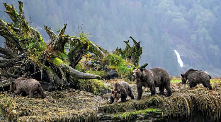 Despite dense settlement and use of the coast by people in the past, the rugged landscape and large waterways, none of these features explained the pattern of grizzly genetic groups. However, the geographies of these three genetic groups strikingly align with those of three Indigenous language families: Tsimshian, Northern Wakashan and Salishan Nuxalk.