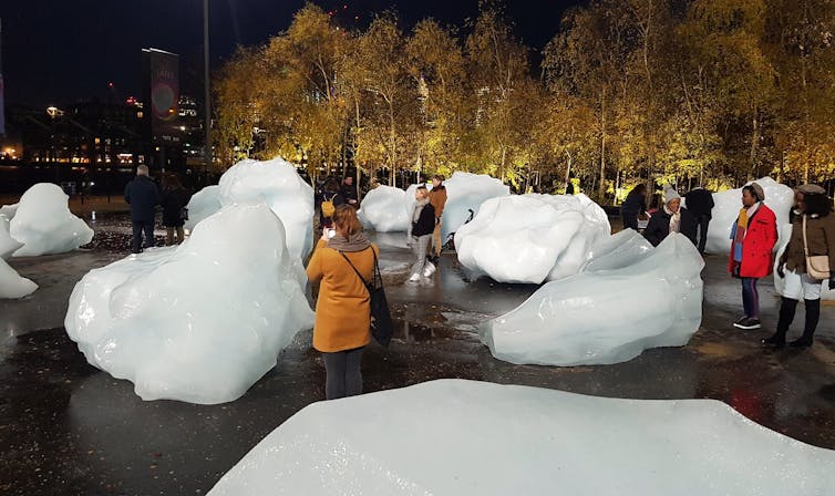 A statement about the artwork noted that the ice sheet from which these blocks were harvested is “losing the equivalent of 1,000 such blocks of ice per second throughout the year.” There were no graphs showing data about melting glaciers. Yet witnesses had a resonating experience about climate catastrophe.