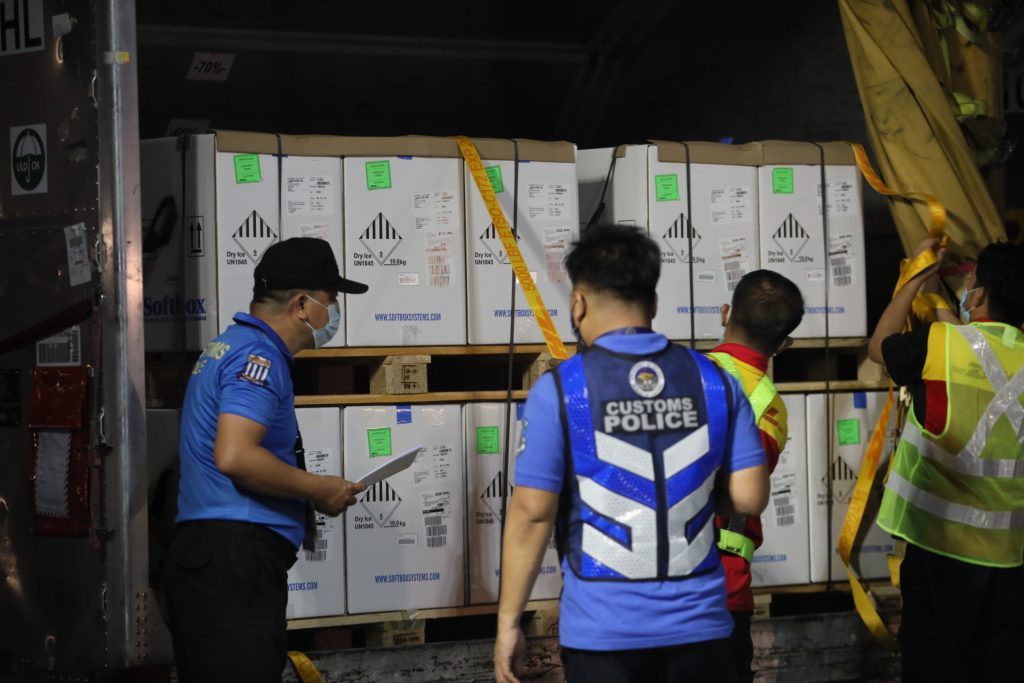 NEW DELIVERY. Customs personnel inspect the shipment of 780,000 doses of the Pfizer Covid-19 vaccine that arrived at the Ninoy Aquino International Airport Terminal 3 via an Air Hong Kong flight on Thursday night (Feb. 10, 2022). The reformulated jabs for the 5-11 age group category were purchased by the government throught the World Bank. (PNA photo by Avito C. Dalan)