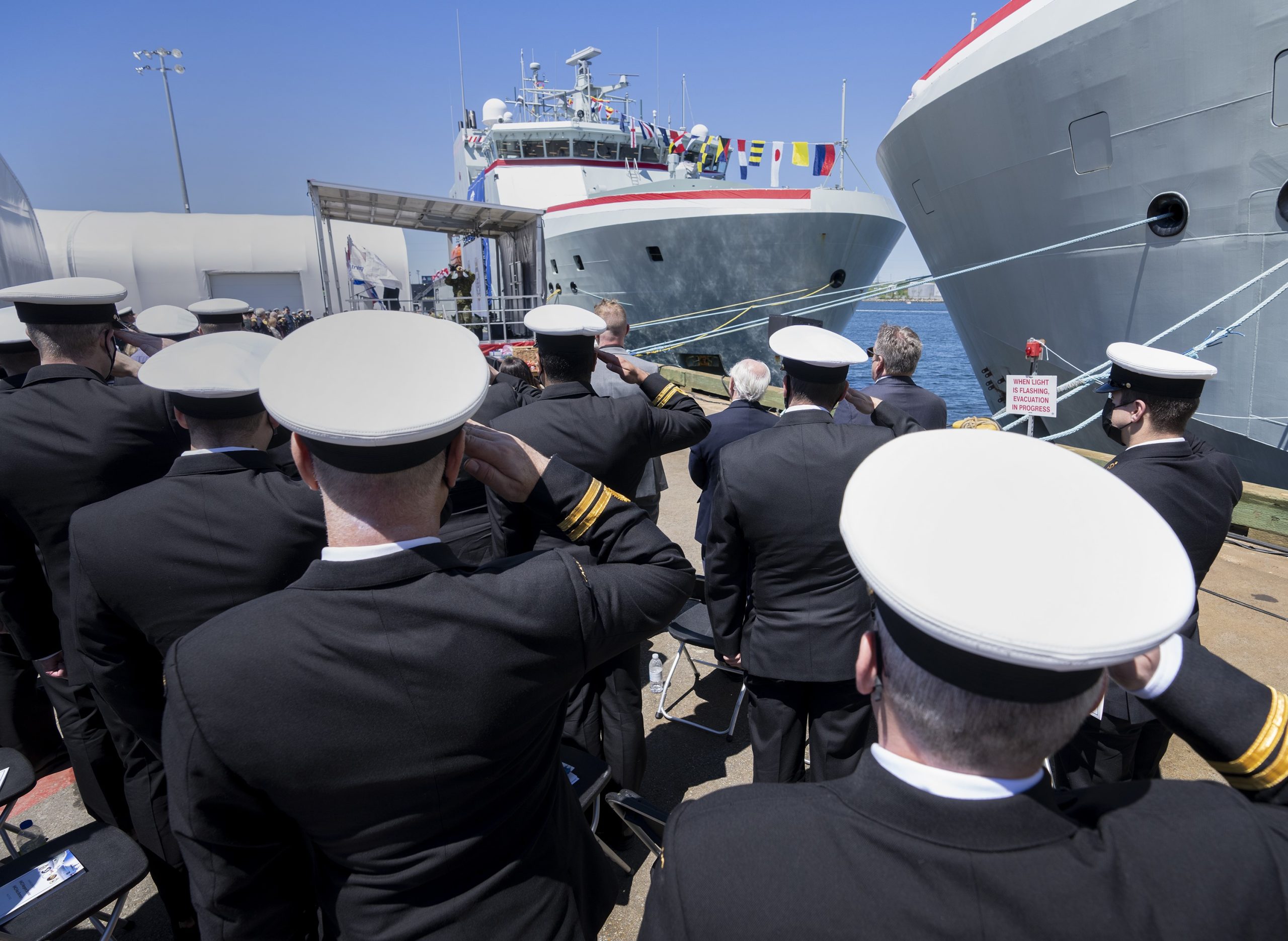 Members of the Royal Canadian Navy salute at a naming ceremony for HMCS Margaret Brooke and HMCS Max Bernays, Arctic and Offshore Patrol Ships (AOPS) at Halifax Shipyards in Halifax on Sunday, May 29, 2022. THE CANADIAN PRESS/Andrew Vaughan