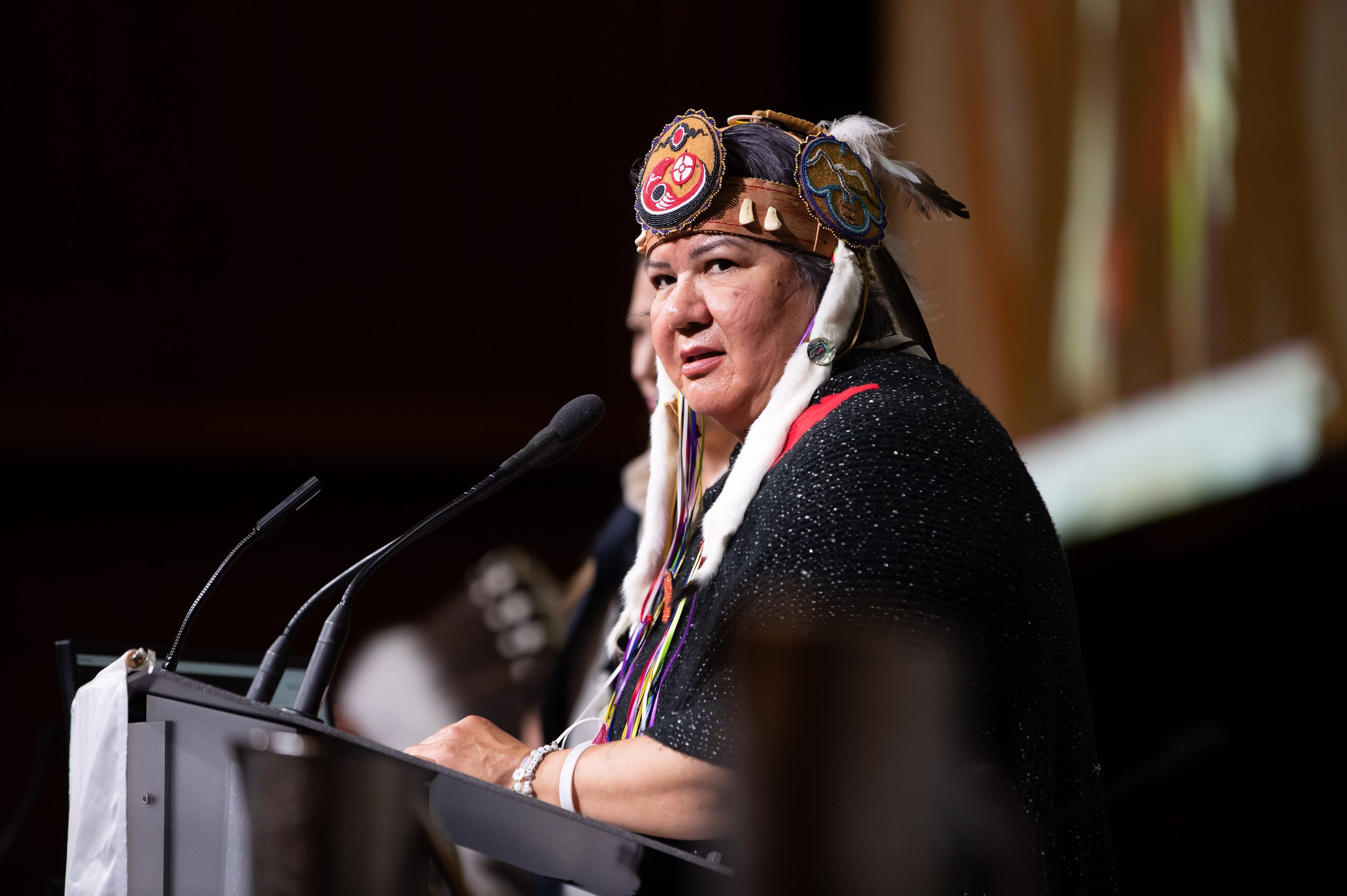 Assembly of First Nations National Chief RoseAnne Archibald speaks during the AFN annual general meeting, in Vancouver, on Tuesday, July 5, 2022. Archibald says it’s wrong for a charity that raises money for the Roman Catholic Church to be soliciting donations from those wishing to see Pope Francis during his visit to apologize for its role in residential schools. THE CANADIAN PRESS/Darryl Dyck