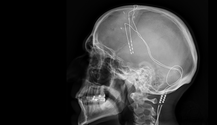 In deep brain stimulation, electrodes – the pale white lines – are implanted into a patient’s brain and connected to a battery in a person’s chest. Jmarchn/Wikimedia Commons, CC BY-SA