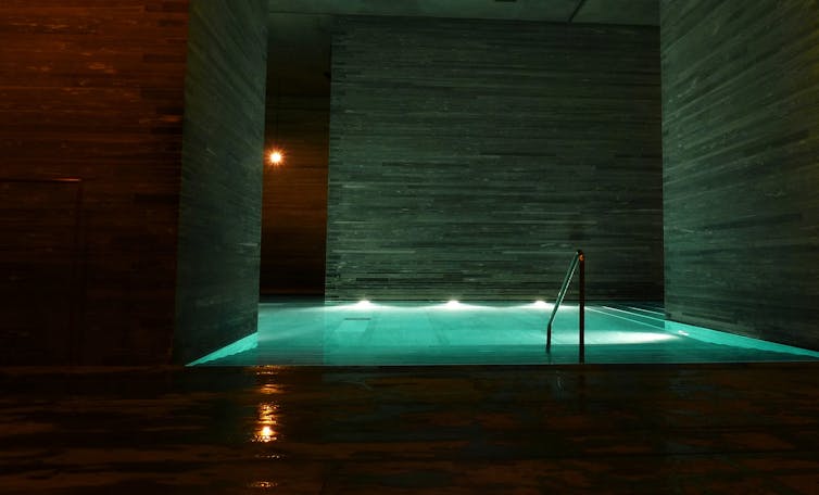 Spa bath in a complex designed by architect Peter Zumthor over thermal springs in the Vals Valley, Switzerland. (Mariano Mantel/Flickr), CC BY-NC