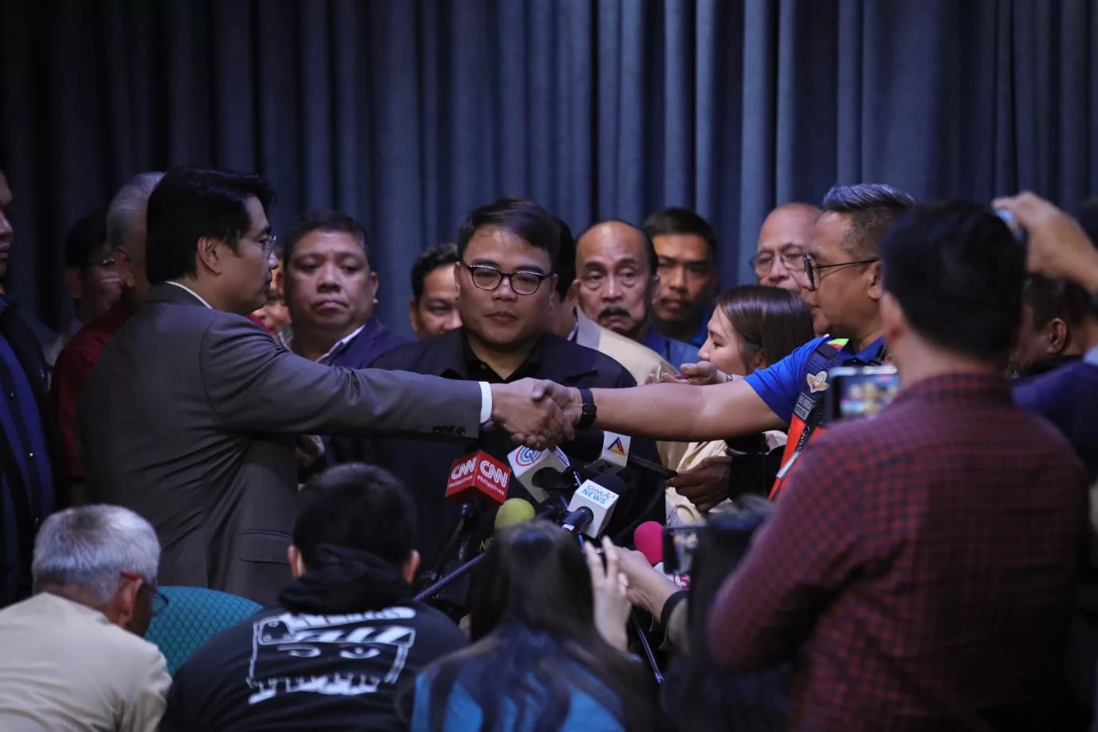 APOLOGY ACCEPTED. Senator Ramon Revilla Jr. (left) accepts the apologies of acting Metro Manila Development Authority (MMDA) Chairperson Romando Artes (center) and Task Force Special Operations chief, retired Col. Edison “Bong” Nebrija (right), after they met the lawmaker at the Senate on Wednesday (Nov. 15, 2023). Revilla said he would no longer push with his plan to recall the MMDA’s 2024 budget after his name was dragged in an apprehension made at the EDSA bus lane. (PNA photo by Avito Dalan via Philippine News Agency/Facebook)