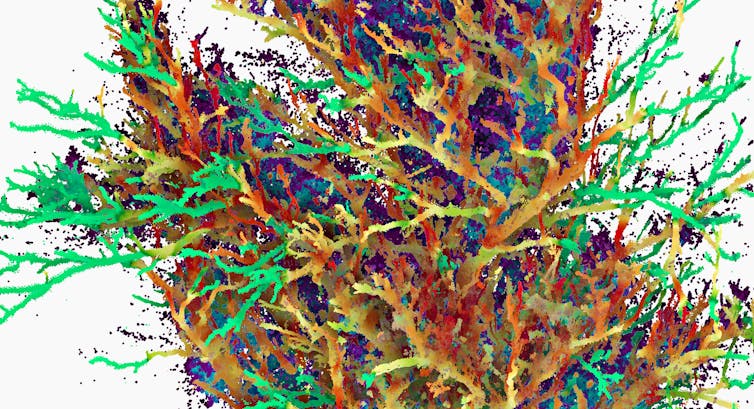 First, we mapped each tree by reflecting many millions of laser beams from each square centimetre of its surface to capture tree canopies as clouds of points. Then we used algorithms to identify and measure significant attributes such as orientation, size and linking of branches. A better understanding of bird preferences for these attributes can inform designs for artificial replacements.