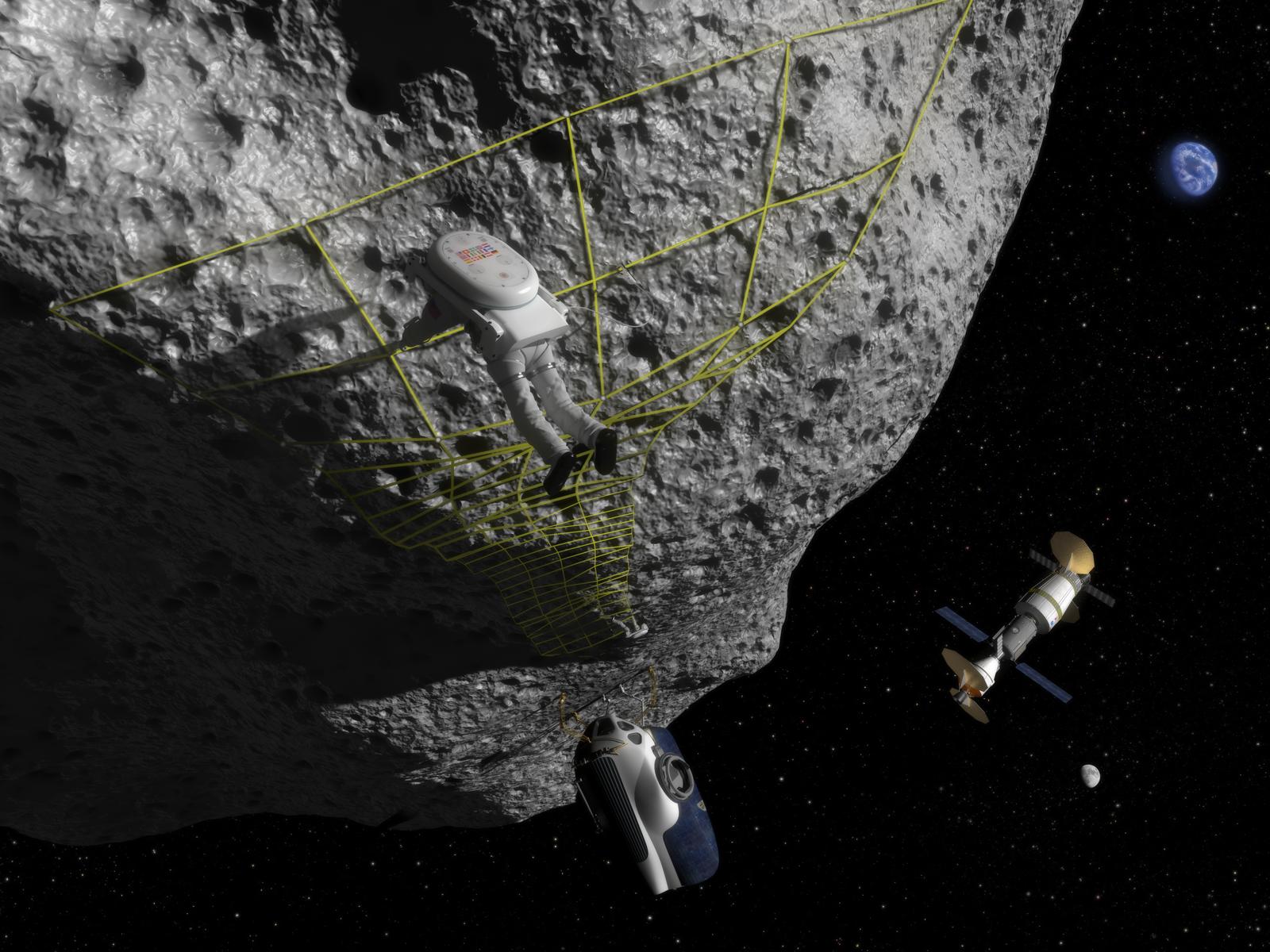 FILE: In this artist’s concept, an astronaut performs a tethering maneuver at an asteroid. The Space Exploration Vehicle (SEV) is close by, with the Orion Multi-Purpose Crew Vehicle (MPCV) docked to a habitat in the background. (Photo By NASA/Wikimedia Commons, Public Domain)
