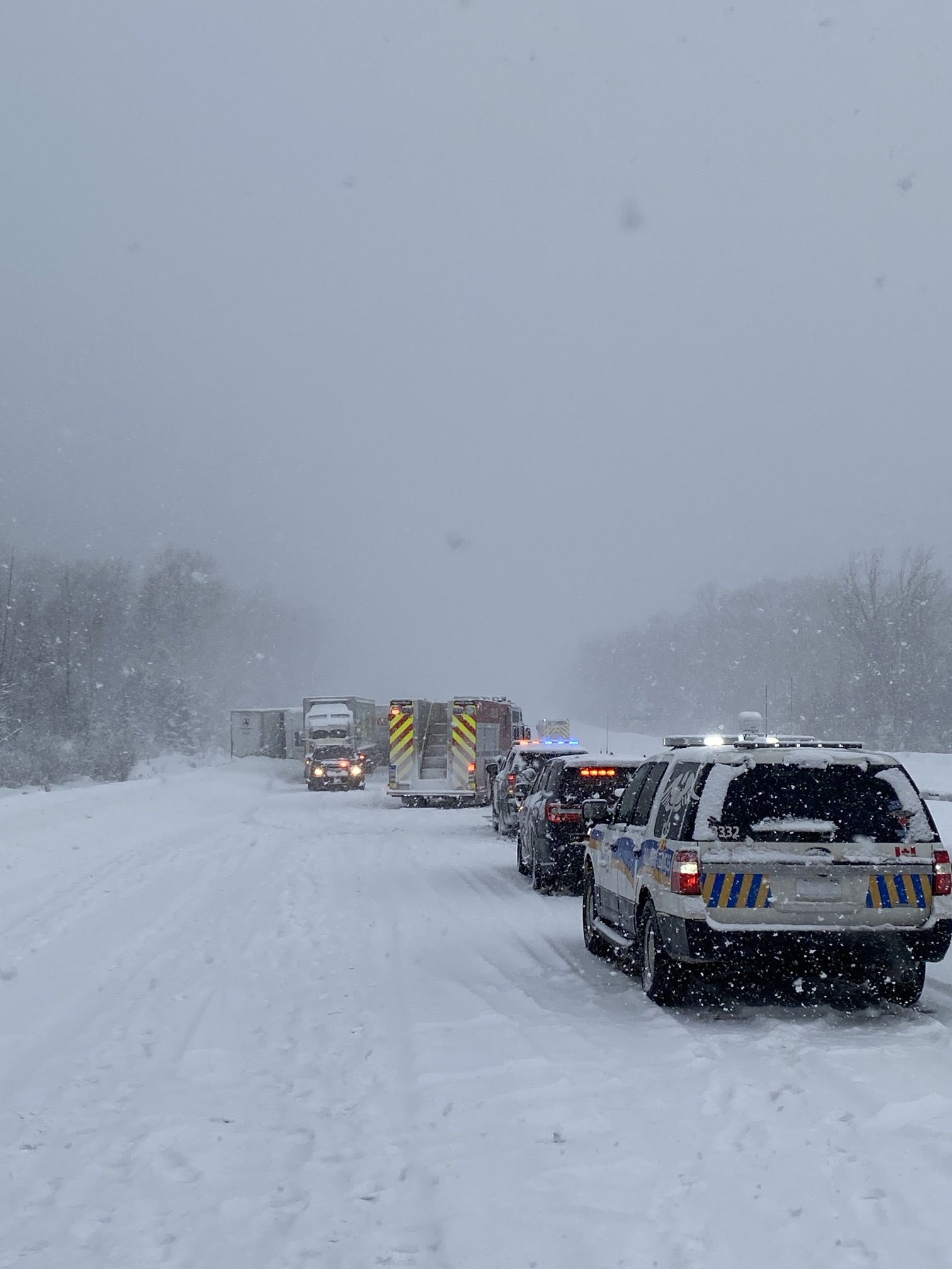 There’s multiple transport trucks involved — like, eight or nine transport trucks. There’s people injured. This is a mess,