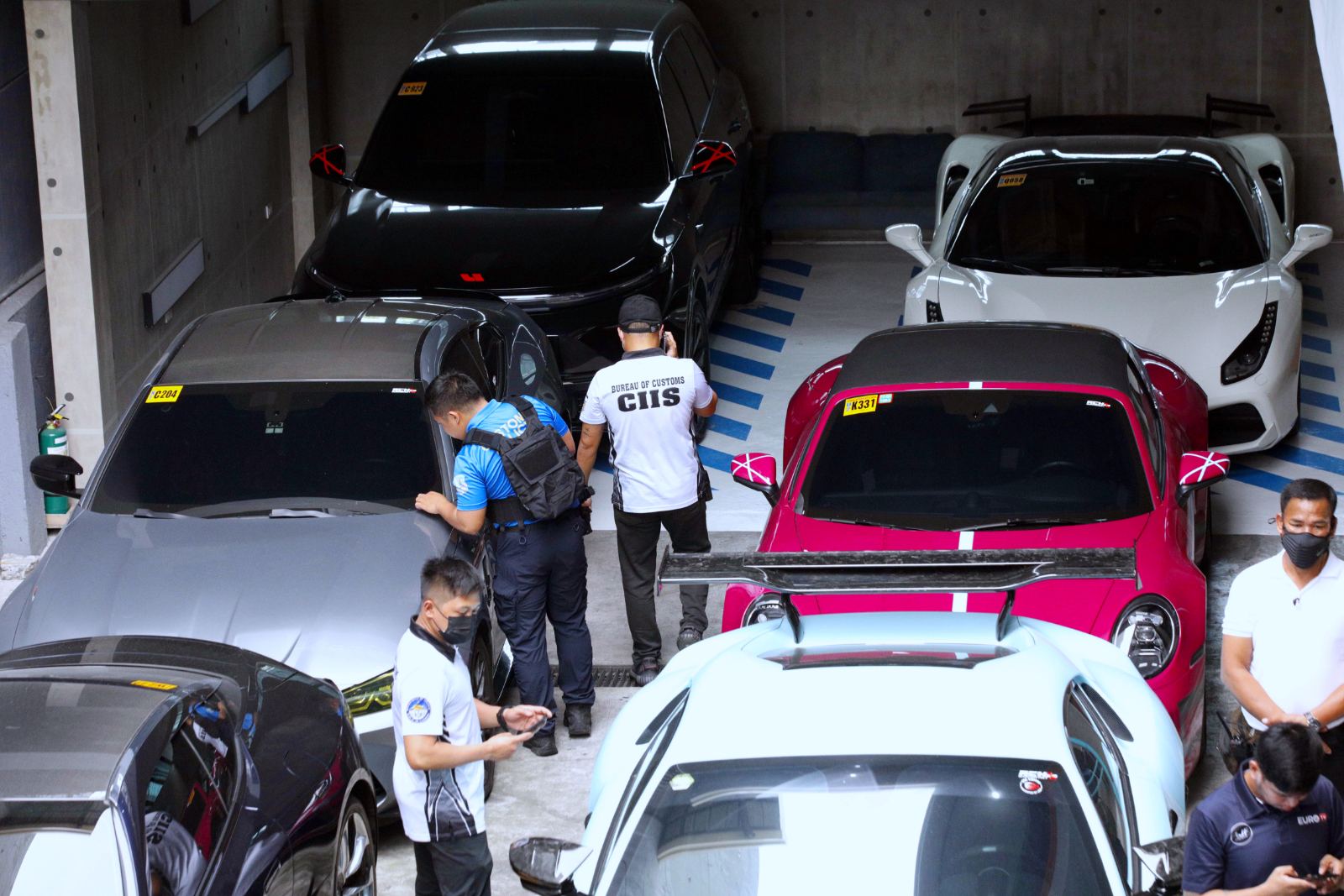 ‘HOT’ CARS. Customs officers inspect luxury vehicles found at a warehouse in Makati City on Feb. 17, 2025. The Customs Intelligence and Investigation Service discovered PHP370 million worth of high-end vehicles, including a Ferrari 812 Superfast, a Ferrari 488, a McLaren 720S, a Mercedes-Benz G63 AMG, and a Bentley Bentayga. (PNA photo by Yancy Lim)