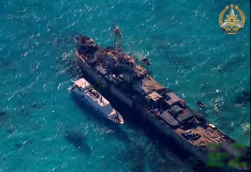 MISSION ACCOMPLISHED. Supply ship M/V Lapu-Lapu is seen here docking alongside BRP Sierra Madre (LS-57) during the rotation and resupply mission conducted by the Armed Forces of the Philippines (AFP), in close coordination with the Philippine Coast Guard at Ayungin Shoal, West Philippine Sea on Tuesday (March 4, 2025). The military said the mission was successfully completed without any untoward incident. (Photo: Armed Forces of the Philippines/Facebook)