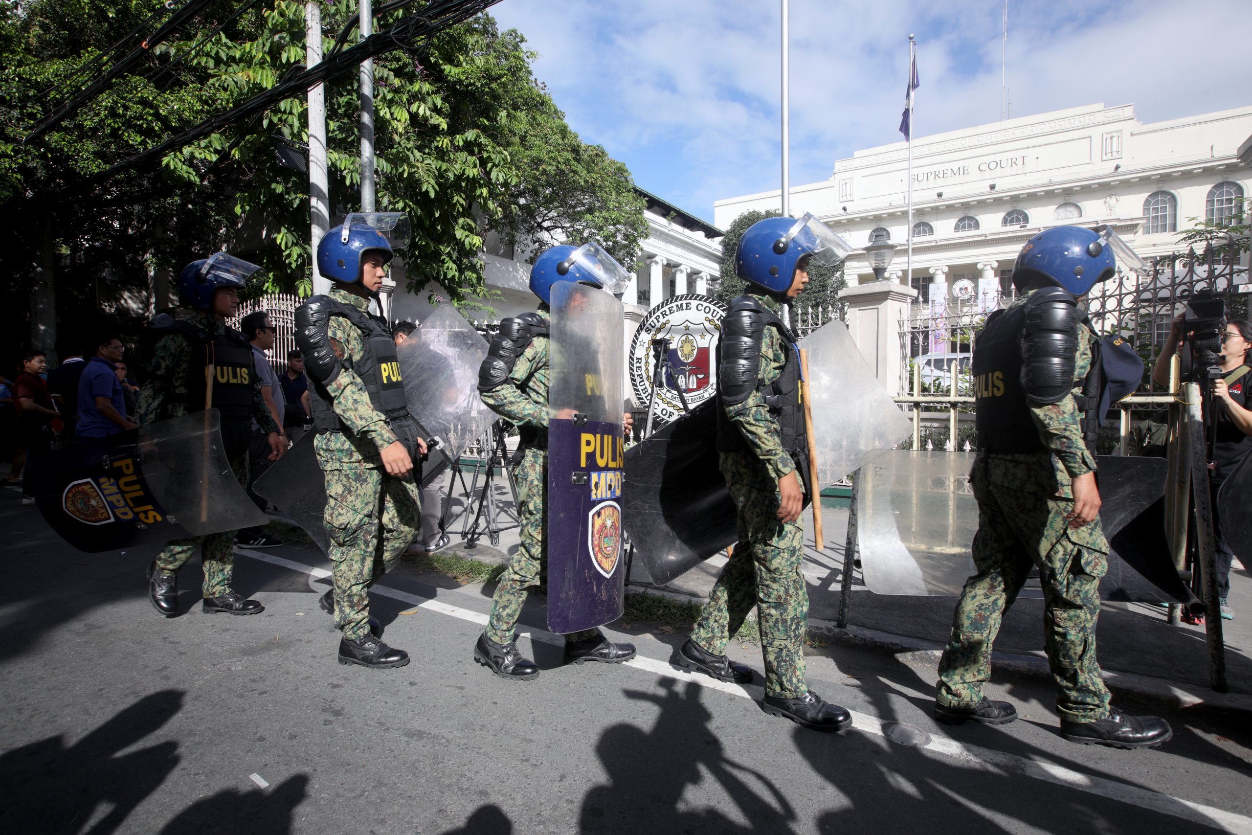HEIGHTENED ALERT. Members of the Manila Police District’s Mobile Force Battalion secure the Supreme Court premises in Manila on Wednesday (March 12, 2025). The Philippine National Police is on heightened alert in anticipation of protest actions following the arrest of former president Rodrigo Duterte in connection with the International Criminal Court’s investigation into his administration’s bloody war on drugs. (PNA photo by Yancy Lim)