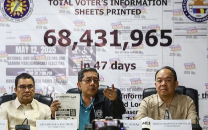 VOTER’S INFO SHEET. Comelec Chairperson George Erwin Garcia (center) answers questions during a press briefing at the National Printing Office in Quezon City on Friday (March 28, 2025). The poll body has completed the printing of 68,431,865 voters’ information sheets for the May 12 midterm elections. (PNA photo by Joan Bondoc)