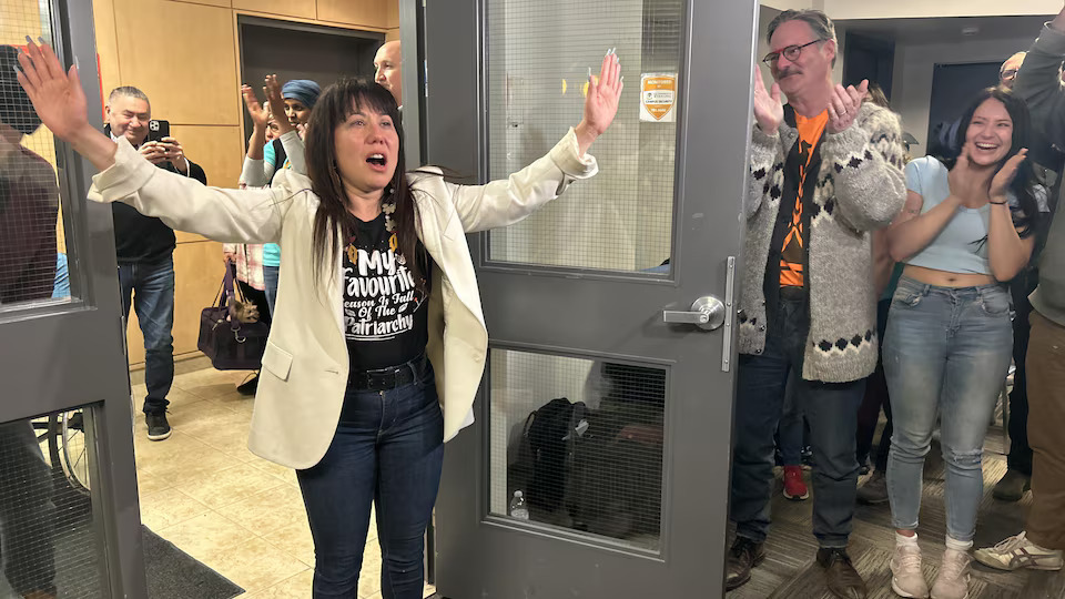 Winnipeg Centre NDP candidate Leah Gazan, a member of Wood Mountain Lakota Nation in Saskatchewan, reacts as she’s greeted by supporters in downtown Winnipeg Monday night after holding onto her seat. Photo: Radio-Canada / Josh Crabb
