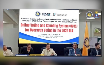 OVERSEAS VOTING. Officials of the Commission on Elections (Comelec) led by chairperson George Erwin Garcia (center) and the joint venture of SMS Global Technologies, Inc. (SMS) and Sequent Tech Inc. hold a press briefing at the Comelec main office in Intramuros, Manila on June 25, 2024. The two institutions signed the contract for the Online Voting and Counting System that will be used by overseas voters in the May 2025 midterm polls. (PNA Screengrab via Comelec)