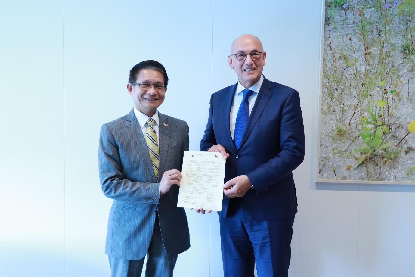 INSTRUMENT OF ACCESSION. Philippine Ambassador to The Netherlands J. Eduardo Malaya (left) deposits the instrument of accession with the Ministry of Foreign Affairs (MFA) of the Netherlands on May 6, 2025.