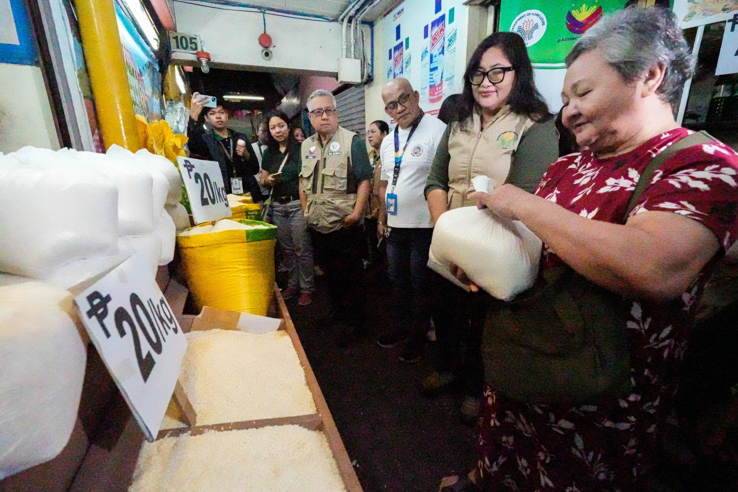 RICE RELIEF. A senior citizen buys rice for PHP20 per kilo during the program launch of the Department of Agriculture, led by Assistant Secretary Genevieve Guevarra (5th from left), at Mandaluyong Public Market 1 on Tuesday (May 13, 2025). The program was launched in Cebu City on May 1 in line with President Ferdinand R. Marcos Jr.’s directives to achieve food security and sufficiency. (PNA photo by Robert Oswald P. Alfiler)