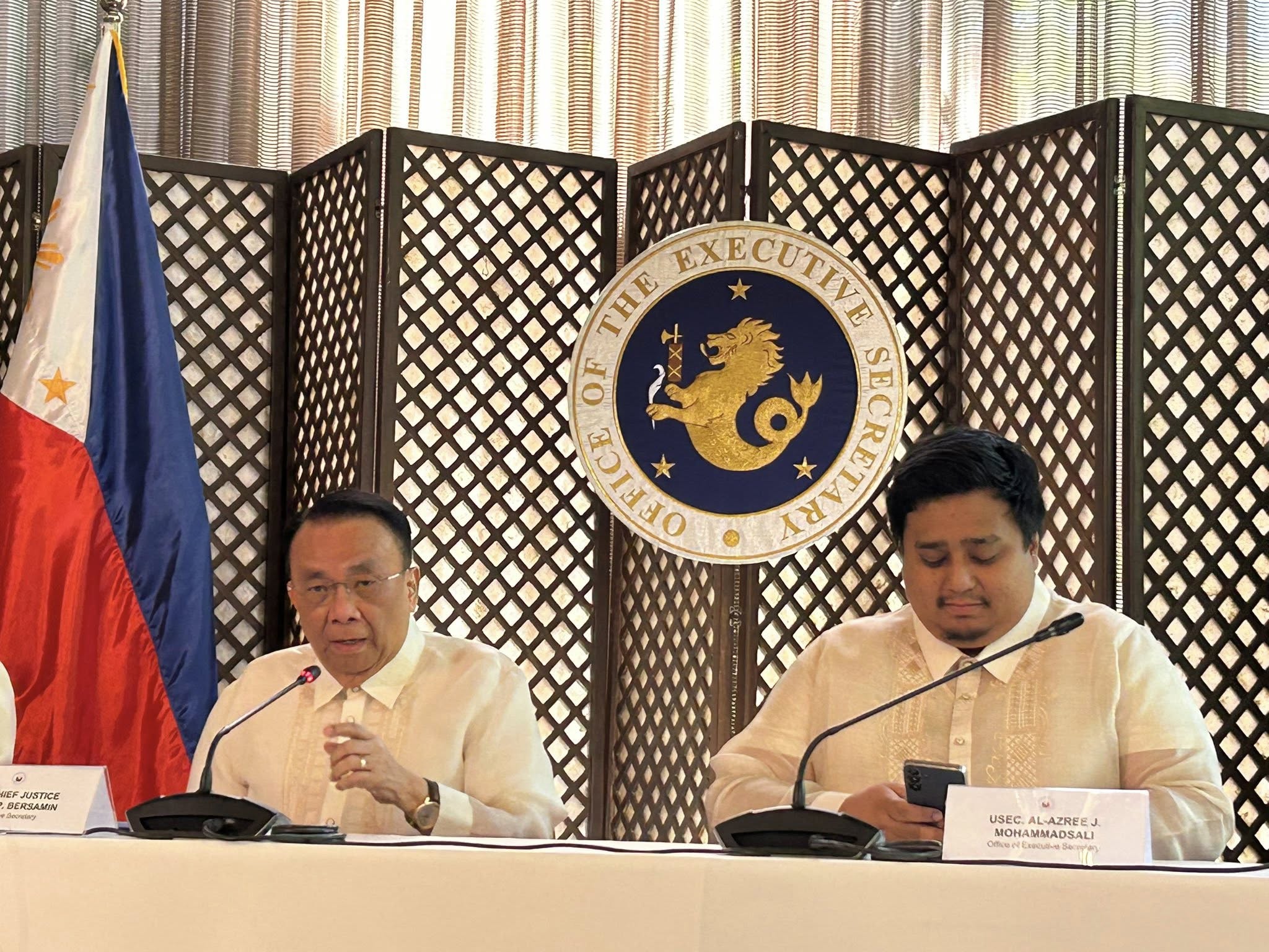 CABINET REVAMP. Executive Secretary Lucas Bersamin (left) holds a press briefing at Malacañang Palace in Manila on Friday (May 23, 2025) to announce major changes in the Cabinet of President Ferdinand R. Marcos Jr. Some 52 Cabinet secretaries and government heads have already tendered their courtesy resignations, but the President retained Bersamin and the economic team. (PNA photo by Ruth Abbey Gita-Carlos)