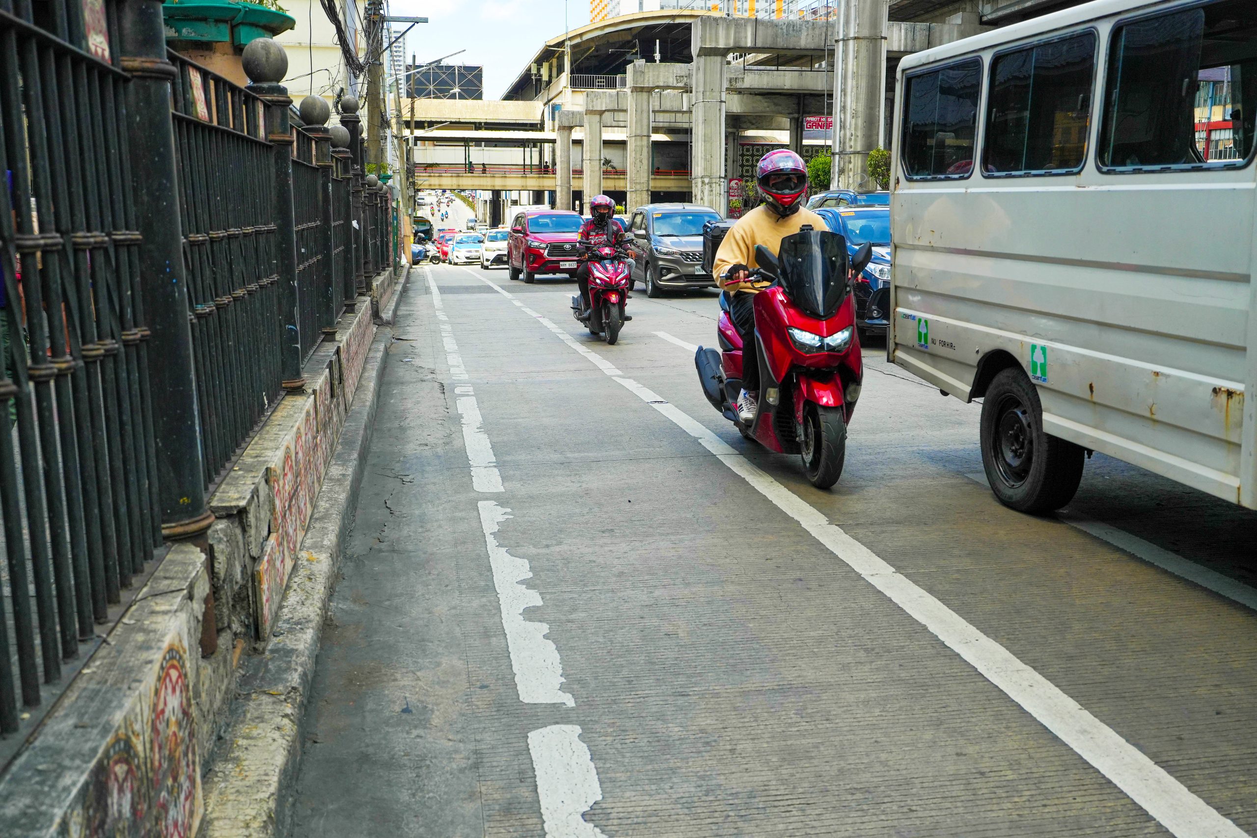 TRAFFIC POLICY. Motorcycle riders avoid the bicycle lane while traversing the EDSA-Cubao service road in Quezon City on Tuesday (May 27, 2025).