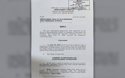 REPLY. The Senate Impeachment Court acknowledges receipt of the House of Representatives prosecutors’ reply to Vice President Sara Z. Duterte’s answer ad cautelam on Friday (June 27, 2025). In the document, the prosecution urged the court to proceed with the trial, asserting that Duterte’s response contained falsehoods and misleading claims. (PNA photo by Wilnard Bacelonia)