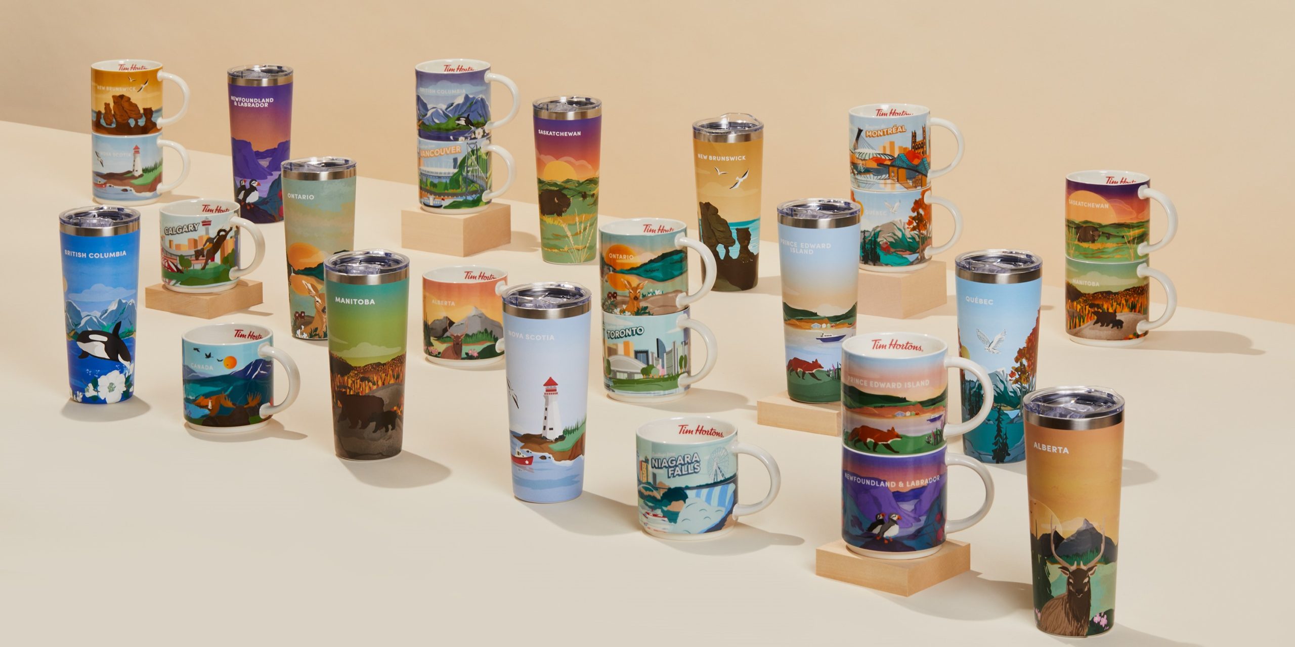 - The 2025 Tim Hortons Travel Collection of drinkware has a lineup of ceramic and stainless steel mugs featuring beautiful landscapes from each province. Ceramic mugs featuring landmarks from Toronto, Vancouver, Montreal, Calgary and Niagara Falls are also available, as is the popular Canada Travel Mug.