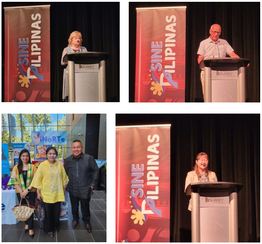 (Clockwise) Surrey Mayor Brenda Locke, Member of Parliament Tako van Popta (Langley–Aldergrove) and Senator Yonah Martin deliver their remarks. Consul General Gina A. Jamoralin and Consul Analyn Ratonel with INARTE Society Managing Director Ryan Ferrer at the Closing Day Reception of Sine Pilipinas 2025. (Photos by Vancouver PCG)