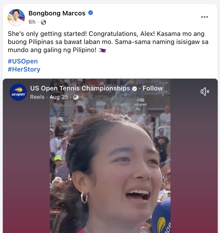 “She’s only getting started! Congratulations, @alex.eala! Kasama mo ang buong Pilipinas sa bawat laban mo. Sama-sama naming isisigaw sa mundo ang galing ng Pilipino! (The Philippines is with you in your every fight. We will all shout to the world the greatness of the Filipino),” the President said in an Instagram story on Monday.