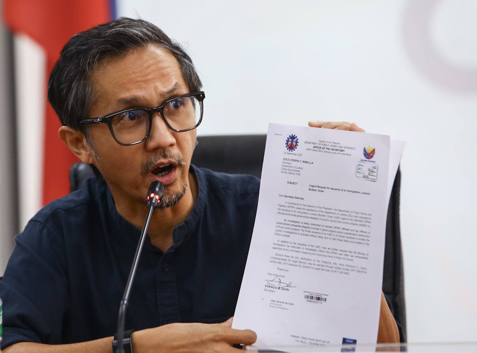 MANILA – The Department of Public Works and Highways (DPWH) has requested the Department of Justice (DOJ) to issue an immigration lookout bulletin order (ILBO) against 25 contractors and government officials who are allegedly connected to questionable flood control projects.