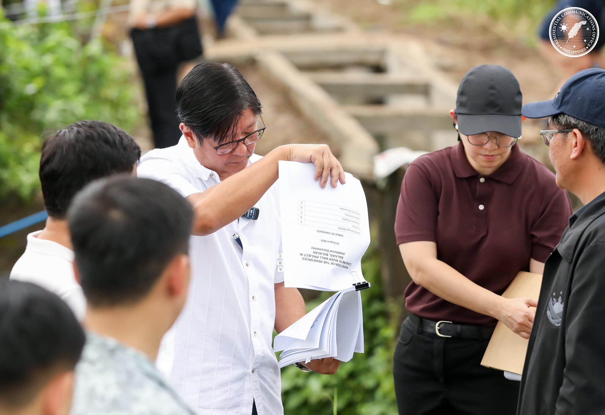 NO INFLUENCE. President Ferdinand R. Marcos Jr. reads documents about a river wall project that was supposed to be constructed in Baliwag City, Bulacan on Aug. 20, 2025. Marcos on Wednesday (Oct. 15, 2025) said he would never attempt to “direct” or “influence” the Independent Commission for Infrastructure (ICI) amid its investigation into anomalous flood control projects. (Photo: Presidential Communications Office/Facebook)