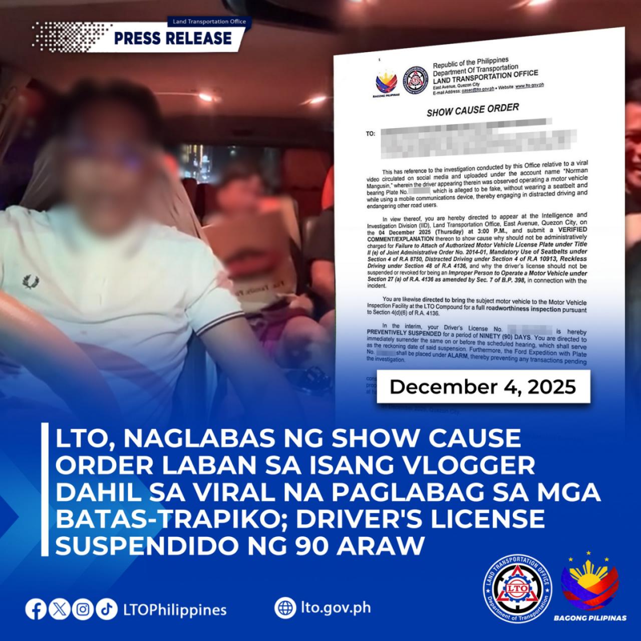 SUMMONED. The Land Transportation Office summoned social media vlogger Norman Mangusin on Thursday (Dec. 4, 2025) for violating several traffic laws. His driver’s license has been suspended for 90 days. (Photo from LTO Facebook page)
