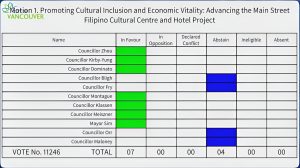 RESULTS. The finalised vote of the Vancouver city council on the Filipino Cultural Centre and Hotel motion. (Screengrab from City of Vancouver/YouTube)