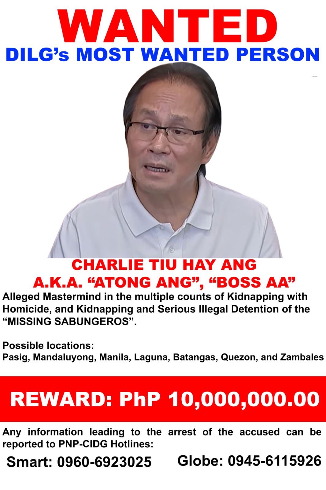 MANILA – Police said Monday they received 40 hotline tips on the possible whereabouts of fugitive businessman Charlie “Atong” Ang.