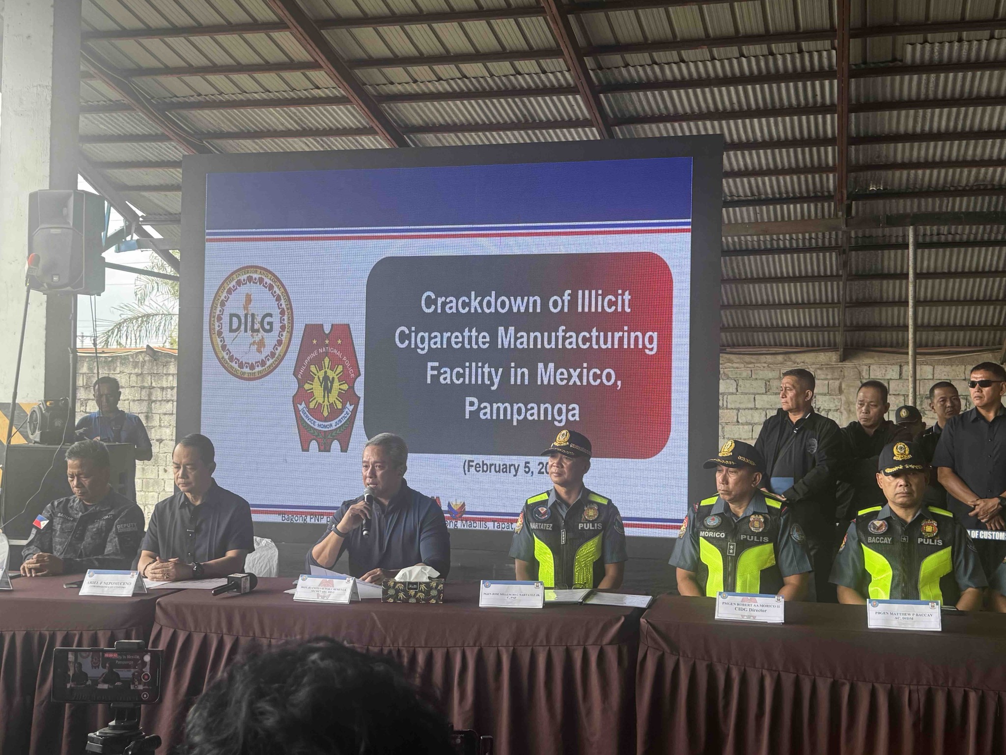 ILLEGAL FACTORY. Department of the Interior and Local Government Secretary Jonvic Remulla (center) leads a press briefing at a warehouse in Mexico, Pampanga that allegedly housed an illegal cigarette factory on Thursday (Feb. 5, 2026). The warehouse was raided by authorities on Jan. 28, resulting in the arrest of six Chinese nationals who are believed to be the factory’s operators, and rescue of 65 Filipino workers. (Photo: PNA/Facebook)