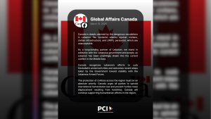 OTTAWA, Ontario — Global Affairs Canada expressed its deep alarm at the dangerous escalations in Lebanon that are heavily affecting civilians, infrastructure, and UNIFIL (United Nations Interim Force in Lebanon) peacekeepers.