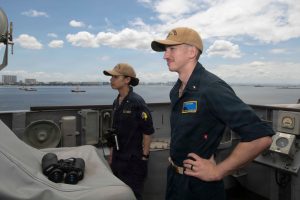 Ensign Ayana Bullock, left, and Ensign Chance Sylvester look out from the bridge wing aboard U.S. 7th Fleet flagship USS Blue Ridge (LCC 19) as the ship prepares to enter port in Manila, Philippines from Manila Bay, March 16, 2026. (Photo courtesy: US 7th Fleet)
