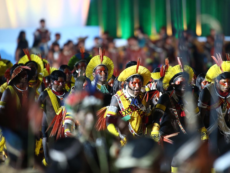 The event, which kicked off Friday, comes one year after Brazil played host to soccer’s World Cup and ahead of next year’s Olympics in Rio de Janeiro. The indigenous event’s hypnotic opening ceremony swirled with eye-popping feather headdresses, sumptuous silk robes, buttery suede dresses and revealing loincloths as the 40-odd delegations melted into one chanting, dancing, pulsating mass of humanity.