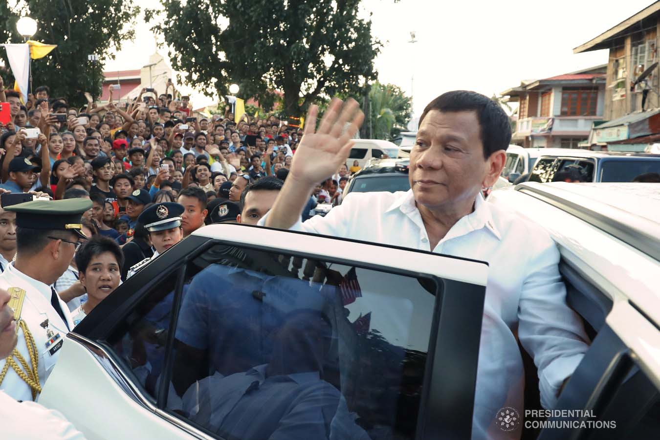 FILE: President Rodrigo Roa Duterte bids farewell to the residents of Balangiga after witnessing the official handover of the Transfer Certificate of the Balangiga Bells at the Balangiga Auditorium in Eastern Samar on December 15, 2018. SIMEON CELI JR./PRESIDENTIAL PHOTO